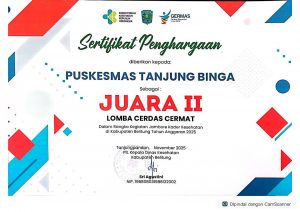 LOMBA CERDAS CERMAT TINGKAT KABUPATEN BELITUNG TAHUN 2025 Uncategorized January 24, 2026January 24, 2026simpor lakiLeave a Comment on LOMBA CERDAS CERMAT TINGKAT KABUPATEN BELITUNG TAHUN 2025 Lomba Cerdas Cermat dalam Rangka Kegiatan Jambore Kader Kesehatan di Kabupaten Belitung Tahun Anggaran 2025Sertifikat Penghargaan diberikan kepada PUSKESMAS TANJUNG BINGA sebagai Juara 2